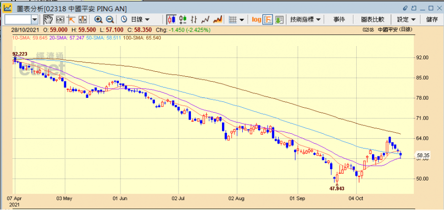 中國平安(02318)(滬:601318) 昨日(27日)收市後公布季績, 第三季純利跌逾三成,壽險及新業務價值疲弱,多間大行調低目標價,今日(28日)股價延續近期弱勢,再跌逾2%,已連跌五日。