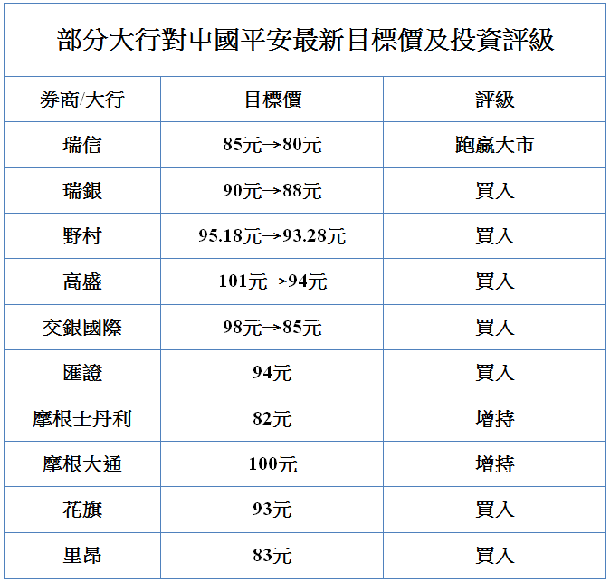 平保公布業績後多間大行隨即下調其目標價,其中瑞信指平保首九個月新業務價值按年跌18%,符該行預期,估算單計第三季按年跌34%,主要受到首年保費收入下跌24%及利潤率收窄至29%影響,經紀人數亦減少。首九個月稅後淨利潤按年倒退21%遜預期,並只達市場對其全年預測之64%,下調今明兩年盈利預測8%,目標價由85港元下調至80港元,維持跑贏大市評級。