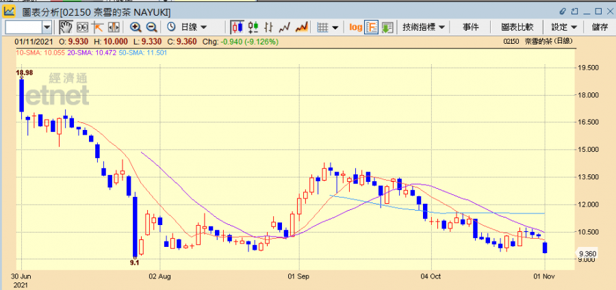 奈雪的茶(02150)收市跌9.13%報9.36元,連跌4日,累跌11.2%。其他內地餐飲股亦全線下跌,其中海底撈(06862)跌4.36%收報20.85元,連跌8日,累跌31.64%;九毛九(09922)跌4.62%報18.6元,連跌4日,累跌8.6%;呷哺呷哺(00520)跌4.21%報5.46元,同樣連跌4日,累跌12.64%。