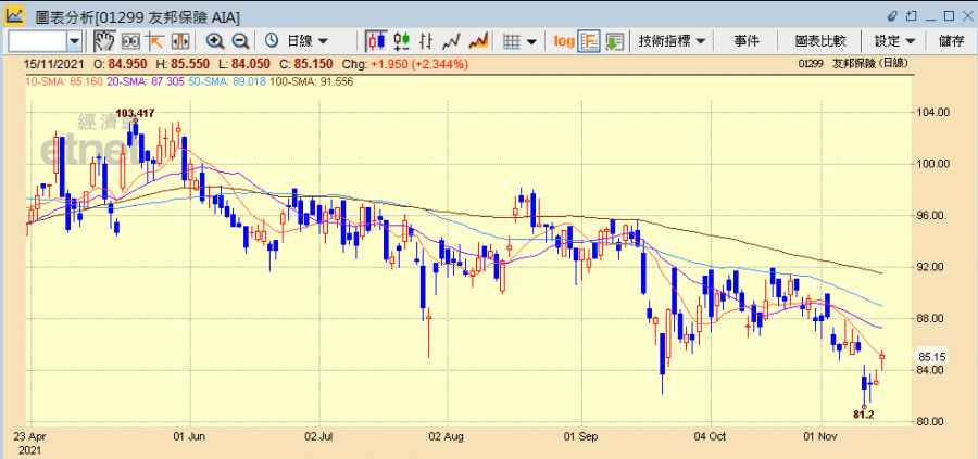 高盛則指友邦第三季新業務價值大致與該行及市場預期一致,而第三季新業務價值放緩,主要反映2021與20年疫情影響,但受產品組合變化和費用減少的共同推動,香港和泰國業務繼續保持強勁增長,預計這將持續到第四季度,支持新業務價值雙位數增長預期,而對於2022財年,中國地區的增長及香港內地遊客潛在銷售復甦,是新業務增長重要的推動因素,予買入評級,目標價110港元。另美銀證券認為友邦第三季新業務價值符合此前預期增長3%,而首九個月新業務價值以固定匯率計增15%,增速較上半年的22%放慢,但第三季業績正面之處為香港業務同比有穩健增長,維持買入評級,目標價109.4港元。另瑞信亦予友邦跑贏大市評級,目標價116港元。