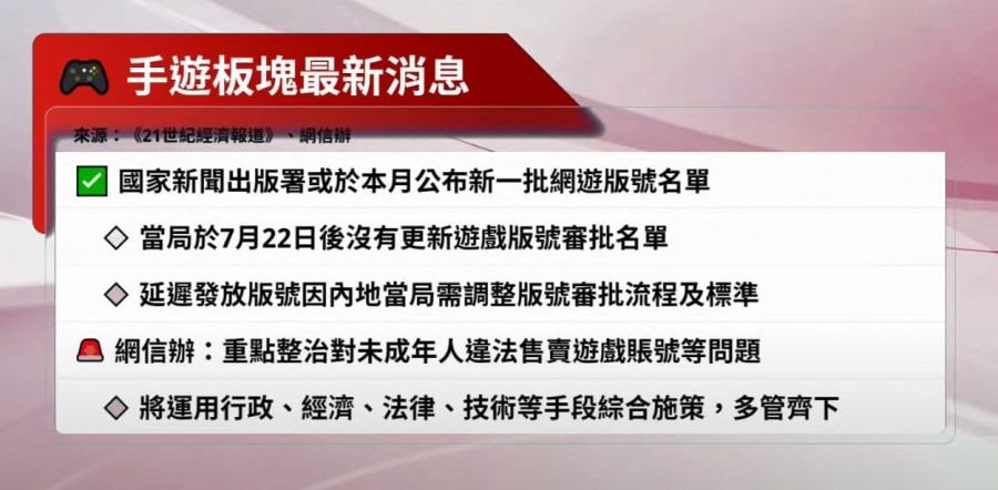 據內媒引述消息人士指,遊戲版號有望月內恢復審批,手遊股昨日落鑊,網易績前升近4%、中手游(00302)升3%、心動公司(02400)更加急升近11%。國家新聞出版署於7月公布國產網絡遊戲版號審批名單後,一直沒有任何更新。難道今次消息證實遊戲一洗內地官媒8月狠批網遊為「精神鴉片」的污名,捲土重來?