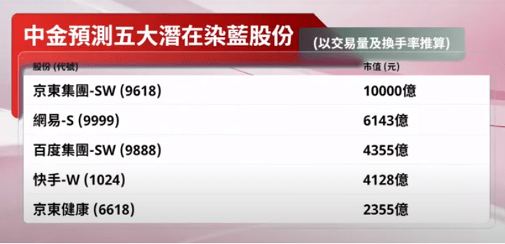 今日(19日)市場焦點之一為恒生指數公司將於收市後公布季檢結果,中金預測了五大染藍股份,全為科技股,包括京東(09618)、網易(09999)、百度(09888)、快手(01024)和京東健康(06618),惟現時恒指成分股中科技股佔比已相當高,會否有其他黑馬會跑出呢?
