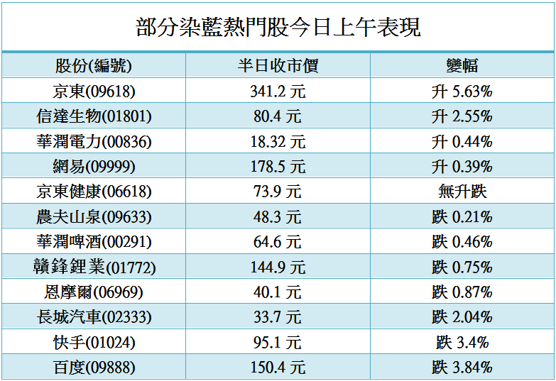 今日市況不太好,恒指半日跌1.76%,科指亦跌1.28%,惟季績理想的京東升逾半成,暫時在眾染藍熱門股中跑出,其他熱門股則升跌不一。