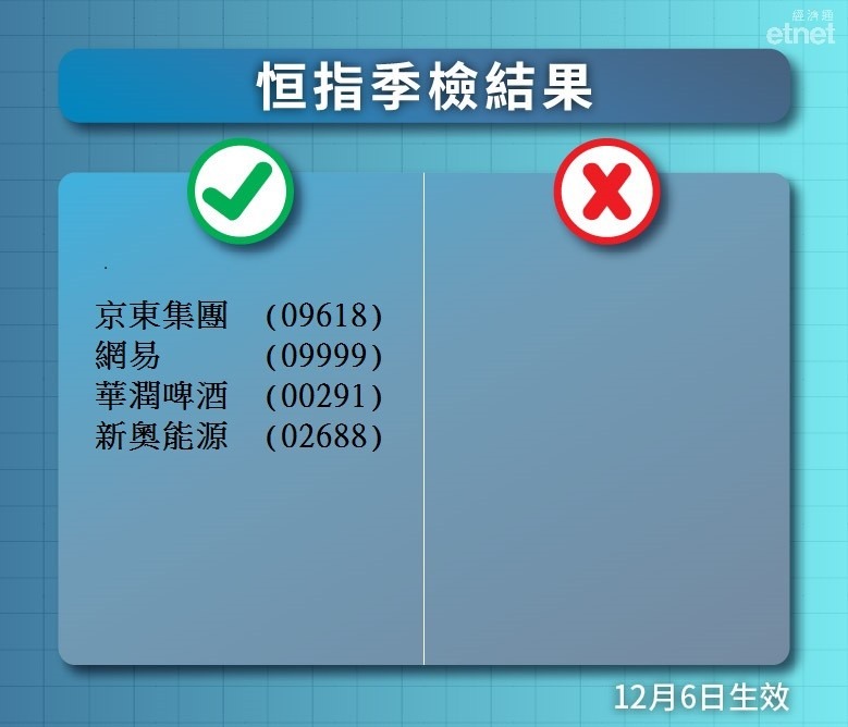恒指公司公布季檢結果,恒生指數成分股納入京東集團(09618),網易(09999)、華潤啤酒(00291)及新奧能源(02688),成分股數目將由60隻增加至64隻。