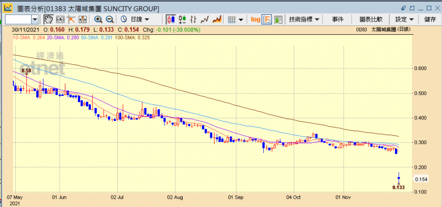 上周末澳門博彩龍頭中介人、太陽城集團(01383)主席周焯華等共11人涉嫌不法經營賭博及清洗黑錢,遭澳門司警逮捕,引發除周焯華旗下的太陽娛樂(08082)股價急瀉三成外,濠賭股昨(29日)亦受累急跌,摩通就預期貴賓廳收入於未來數周減少最多一半。至今日(30日),昨停牌的太陽城及其附屬公司凱升控股(00102)復牌,股價急瀉四五成,而濠賭股雖看來稍為喘定,但持續受事件影響,加上續憂慮變種病毒Omicron或影響通關進度,今日普遍仍下跌,其中永利澳門(01128)跌逾4%。