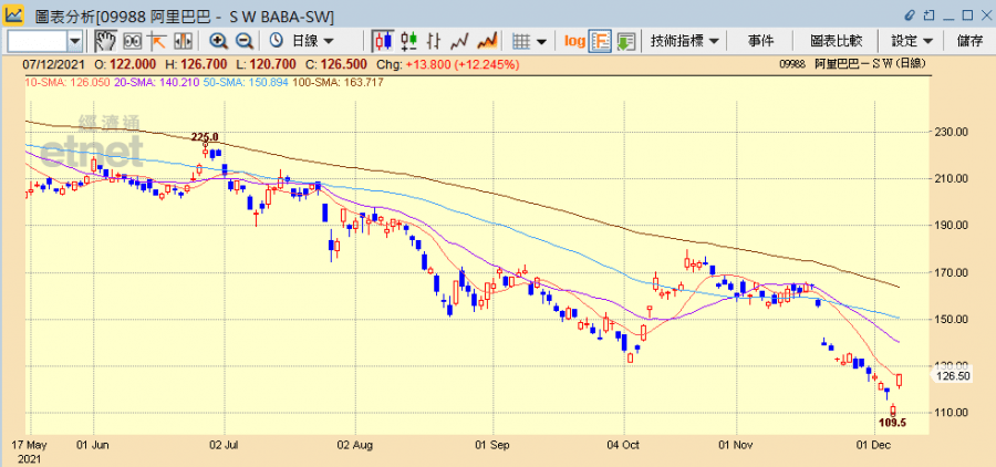 輝立證券董事黃瑋傑於今日《開市Good Morning》節目指,中證監的澄清未必可以解決問題,中概股仍有退市風險,買賣時需留意在美股是否仍有沽售壓力。另如果大市調整,通常弱勢股會先跌,到了弱勢股沽無可沽,近期的強勢股如京東、小鵬汽車(09868)和理想汽車(02015)等近兩三日跌幅也頗大,就明顯是要追跌。其中阿里受多重因素影響持續下跌,除近期中概股退市擔憂外,還有監管陰霾揮之不去,高層變革會為公司前景帶來不確定因素,7、8月時曾有文章指阿里高層管理出了些問題,影響營運及市場對其前景的看法,現在高層有些變動會否收效要一段時間觀察,而在這段不明朗期股價或受壓,建議趁反彈減持。股價走勢上可見近期高位都與10天線有距離,現10天線處於126.7元,若只差一兩元也可把握機會趁反彈沽出。