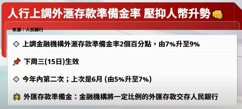 人行指出,為加強金融機構外匯流動性管理,決定自下周三(15日)起,上調金融機構外匯存款準備金率2個百分點,即外匯存款準備金率由現時的7%升至9%。事實上,今次是人行年內第二次上調外匯存款準備金率,上次是在5月31日,當時將外匯存款準備金率由5%升至7%。