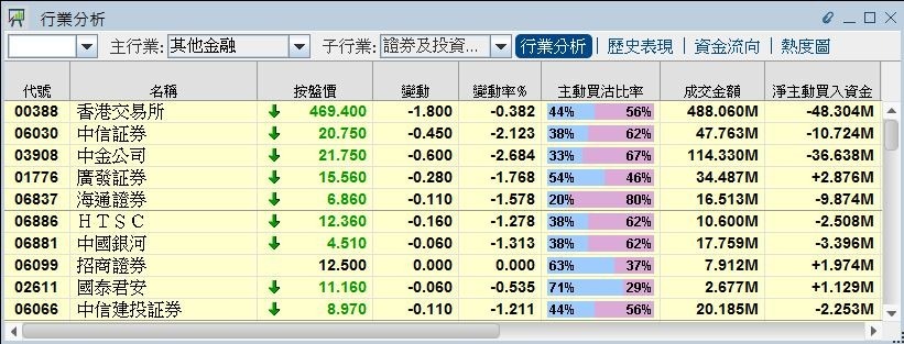 截至半日,普遍中資券商股走弱。(《經濟通HV2報價系統》截圖)