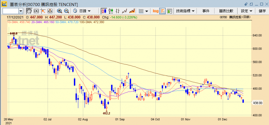 本周環球央行密集議息,首先美國聯儲局本周三(15日)宣布加快縮減買債,將每月縮減買債規模提高一倍至300億美元,計劃明年3月結束買債,並暗示明年可能加息3次,一日後英倫銀行又落實加息,將政策利率由0.1厘加至0.25厘,成首個G7國家加息,另歐洲央行重申緊急抗疫購債(PEPP)將如期於明年3月結束。環球市場資金流料將由寬轉緊,對依靠流動性推動高昂估值的科技股及新經濟股不利。恒生科指繼上日創面世以來新低後,今日持續尋底。