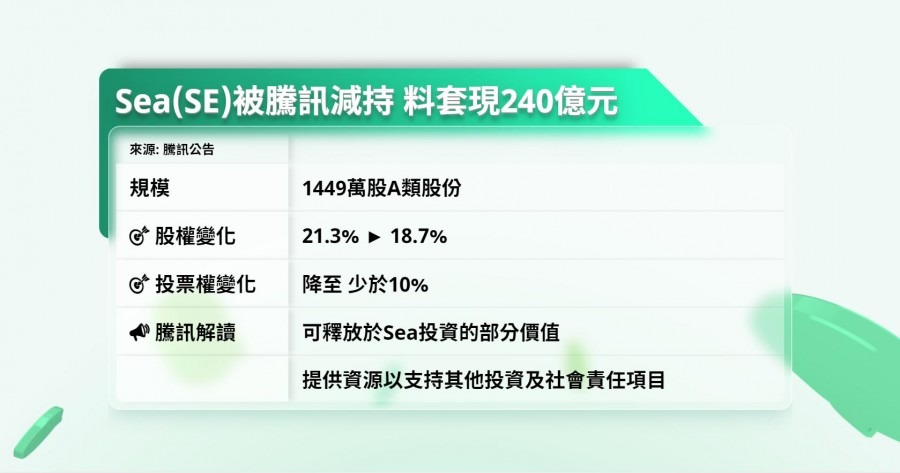 據騰訊公告,公司擬減持Sea的1449萬股A類股份,料套現最多30.7億美元(折合約240億港元)。完成交易後,騰訊於Sea的持股比例將由21.3%降至18.7%。連同建議的股份投票權變動,騰訊於Sea的投票權將降至10%以下。集團指,今次減持可釋放Sea投資的部分價值,並提供資源以支持其他投資及社會責任項目。