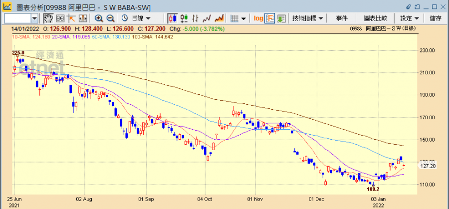 另外,他指中國信達退出認購螞蟻金融可見監管猶在,螞蟻是否還是高增長股份成疑,如果只是一間支付公司沒甚麼意義,它原本最吸引人之處是用很低價錢取得資金再用信用卡息率貸出去,差不多無本生利,如跟規矩做,利潤就只和內銀相若。信達在內地經手很多打包壞帳,而少它買20%股份對公司一定有影響,不過阿里之前跌至109.2元料距底位不遠,已買入可續持有,之前大裂口底部為139元,最近曾升至136元,再升空間有限,如頸線123元守不住,最壞情況可能穿100元。