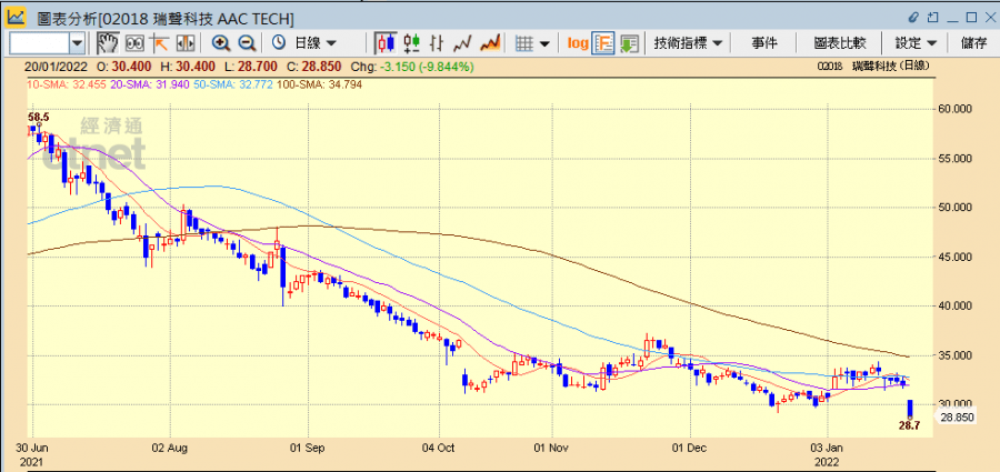 手機設備供應商瑞聲科技(02018)發盈警,預期去年第四季純利減少約71%至79%,又料今年上半年營運持續受供應鏈中斷等多項不利因素影響,大行隨即唱淡,瑞聲今日(20日)股價急跌近一成,創52周新低,為表現最差藍籌。