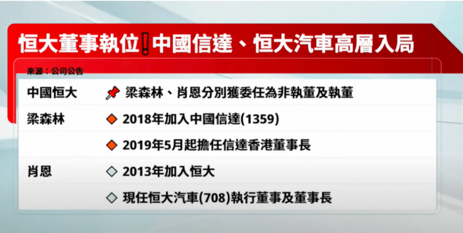 要了解恒大基本面有沒有改變,首先要了解人事變動的重要性,市場關注點明顯落在獲委任為非執董的梁森林身上。梁森林於2018年加入中國信達資產管理股份有限公司,自2019年5月起出任信達香港董事長。值得留意,信達香港為中國信達(01359)全資子公司,而中國信達正是國有四大資產管理公司之一,主要從事境內外不良資產投資、債權投資及證券投資、中長期債券發行及跨境金融服務等。