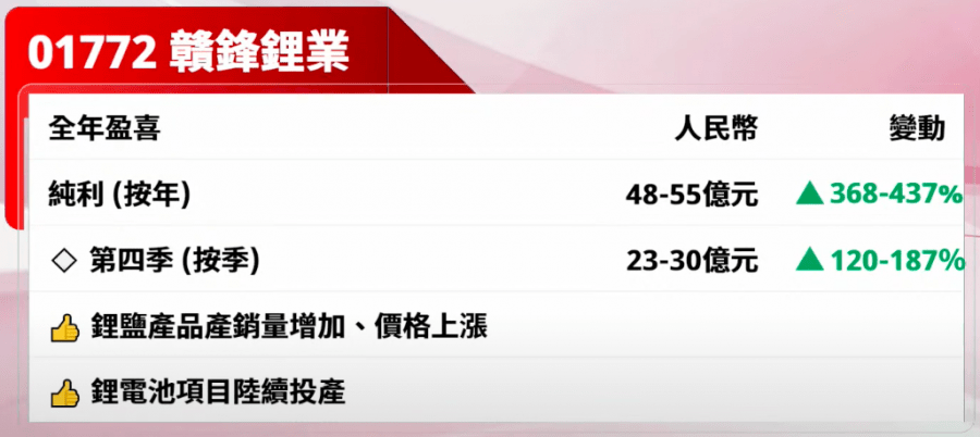 贛鋒鋰業(01772)(深:002460)AH股昨日(24日)齊齊飆升,疑似有春江鴨先行部署!公司上日收市後發盈喜,預料去年多賺最多近4.4倍,帶動股價連升第四個交易日,半日漲逾2%。不過,專家提醒業績預告內藏「魔鬼細節」,並關注鋰原材料價格能否繼續上漲。