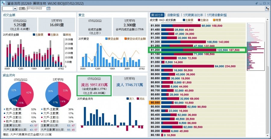 話雖如此,市場不收貨是不爭的事實。據《etnet強化版MQ》的資金流向數據,藥明生物自開市後5分鐘已開始錄得資金淨主動賣出,截至早上10時30分,淨質貨規模增至近6000萬元,佔成交金額11%,規模不容看輕。普通大戶主動買沽比率僅29:71,反映普通大戶沽家的入市態度極度進取。相對可幸的是,以金額計,淨主動賣出最多的是散戶,而非更具參考性的超級大戶及特大戶。據《經濟通HV2報價系統》,81.2元的主動對盤交易總成交股數最多,暫可被視為即市好淡分界線。