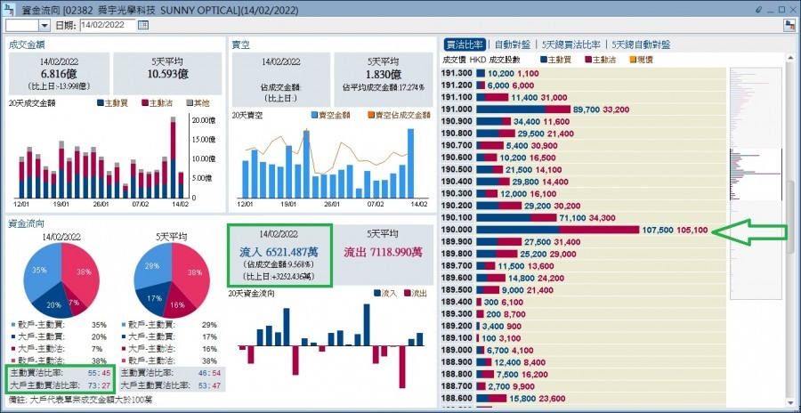 舜宇非散戶買家的入市態度明顯較整體買家的進取(左下角綠框)。