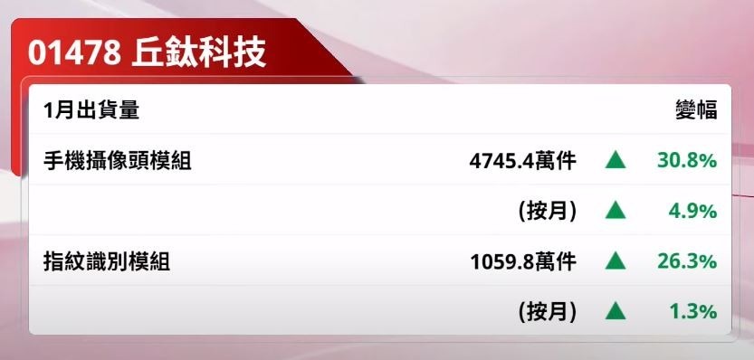 反觀丘鈦科技,手機攝像頭模組上月銷量4772.3萬件,按年升31%、按月升4.6%,兩者皆升幅收窄;指紋識別模組銷量1059.8萬件,按月升幅收窄10.7個百分點至1.3%。雖然丘鈦日中跌過逾2%後,目前倒升近1%,但其暫錄逾200萬元資金淨主動賣出,佔成交金額比率高達近31%,反映市場參與者積極沽貨。