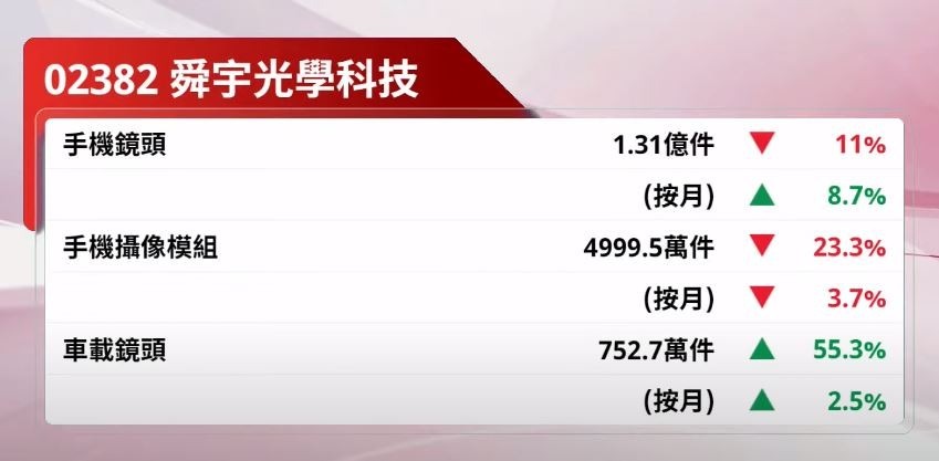 不過,中金派定心丸,看好其車載鏡頭業務表現。該行指出,舜宇的車載鏡頭按年仍錄升幅,反映公司的市場份額處穩定水平,且汽車供應鏈芯片短缺問題已開始見改善,看好公司作為龍頭車載鏡頭供應商之一,將持續受惠於汽車智能化轉型。