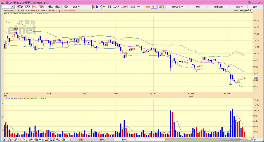 藥明生物近日成交量不配合升勢,且保歷加通道持續下移。
