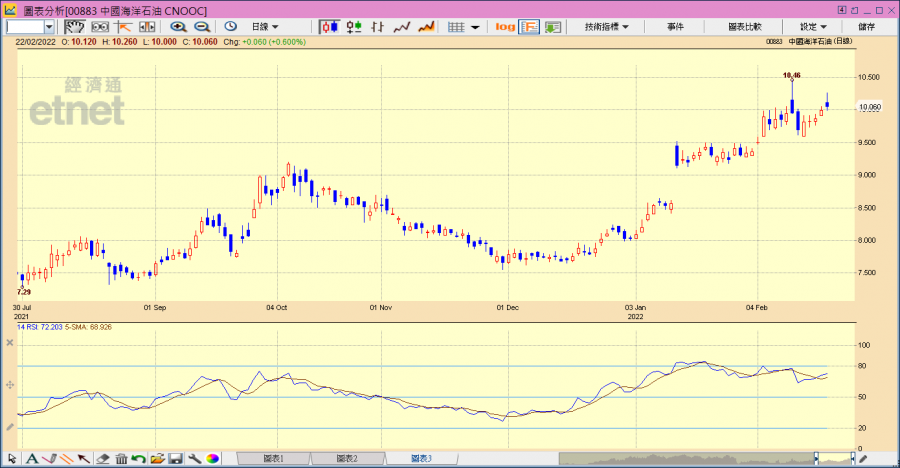 在中海油的日線圖上,RSI與股價背馳,前高位10.46元前阻力大。