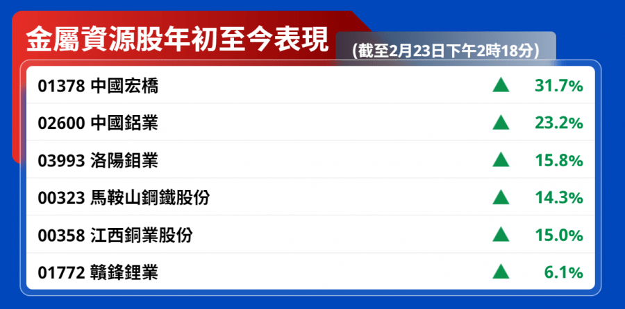 金屬資源股年初至今表現亮麗,中國宏橋(01378)及