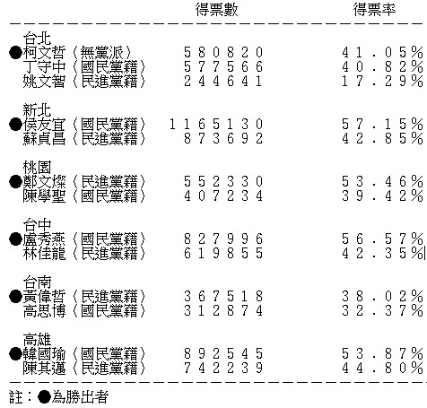不過,早前選情一直膠著的台北市,有國民黨「老黃忠」之稱的丁守中以3254票之差不敵現任台北市長、無黨派的柯文哲。