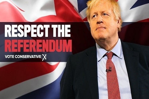 約翰遜於競選廣告中呼籲尊重2016年脫歐公投結果,並再次承諾明年1月31日前「完成」脫歐。
