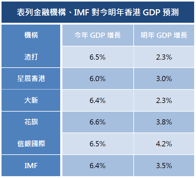 新冠肺炎疫情於去年席捲全球,隨著疫苗推出,疫情於2021年漸趨緩和,本港已接種第一針疫苗的人口已逾七成,加上年內財爺向全港市民大派5000元電子消費券,雖然仍未有全面通關的時間表,但本港經濟於年內已有復甦跡象。財政司司長陳茂波早前預期,首三季香港經濟按年擴張7%,預計今年全年香港的經濟增長可達6.4%。展望2022年,本港經濟復甦很大程度上取決於疫情發展及通關,不過機構預料由於基數效應,明年本港經濟增長將放緩,估計增幅介乎2.3%至4.2%。