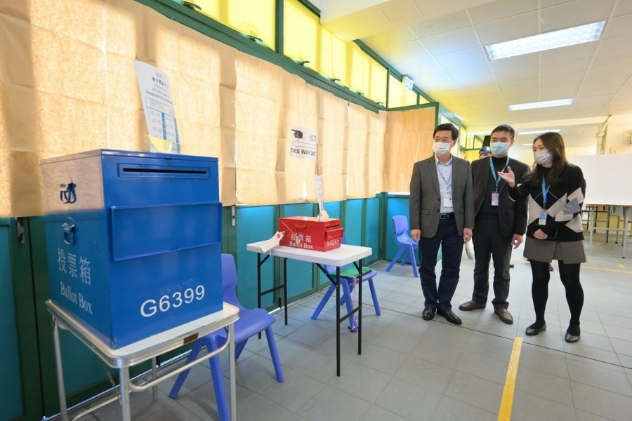 今年立法會選舉投票率僅30.2%創新低,圖為政務司司長李家超(左)當日巡視投票站。(香港政府新聞網)