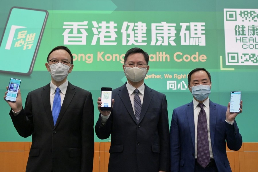 創新及科技局局長薛永恒(中)12月初公布,港康碼系統12月10日起開通。 (香港政府新聞網)