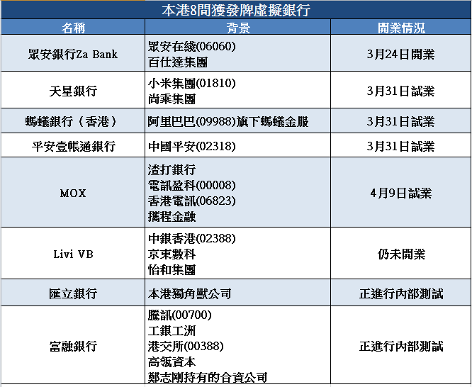 金管局發出的8間虛擬銀行牌照當中,ZA Bank為率先開業的銀行,而小米與尚乘集團合資的天星銀行及阿里巴巴的螞蟻銀行等上月底亦宣布啟動試業,渣打旗下的MOX在4月初亦加入試業行列。