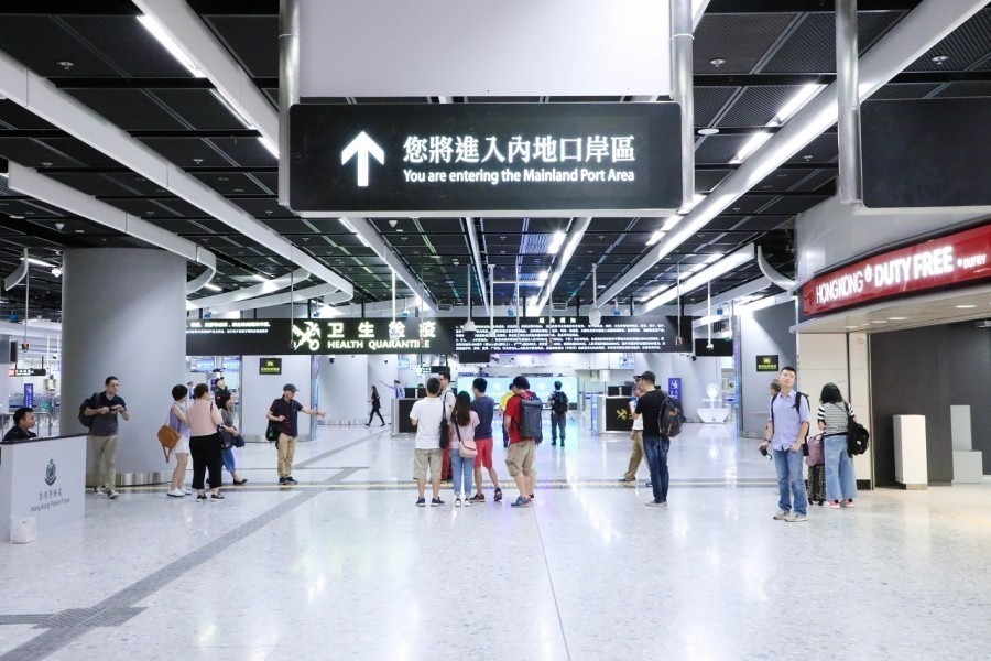 於香港西九龍站辦理出境手續後,進入內地口岸區界線前設有標示(Kenji攝)