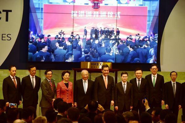 港交所主席周松崗儀式上表示,「深港通」是中港兩地互聯互通的新篇章,在一國兩制下,可以為中國資本帳開放的進程作出貢獻。