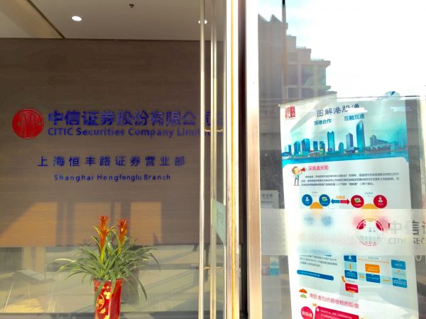 中信証券上海恆豐路營業部在門口展示「深港通」宣傳海報 (駐滬記者王嘉寧攝)