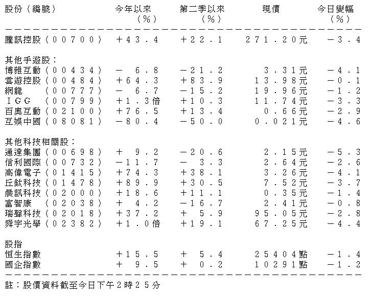 表列騰訊及部分手遊股及科技相關股份表現
