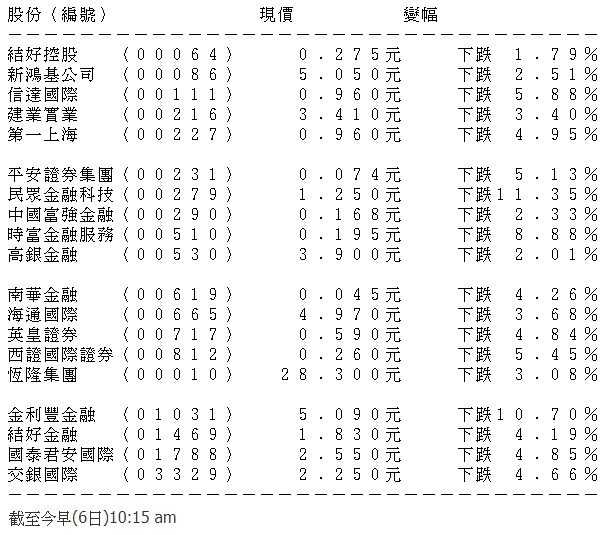 券商股全線隨市向下 民眾金融及金利豐均急挫約11%