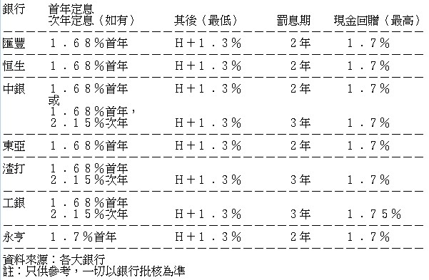 劉圓圓說,目前本港有7間銀行提供定按產品,公司都有提供這些銀行的定按產品給客戶。部分銀行的定按利率低至1.68%,較浮息按揭利率還要便宜,但定按期較短,只有一年。不過,將1.68%首年定按的利息開支,與H+1.25%的H按產品相比較,一年可節省佔總貸款額約14%的利息開支,都好吸引。因此,她建議用家選擇定按會較為化算,但是,除利息開支外,亦要衡量其他因素,如罰息期長短和現金回贈多寡等。不過,用家須留意,在定息期過後,定按產品一般的利息會較浮息的為高。