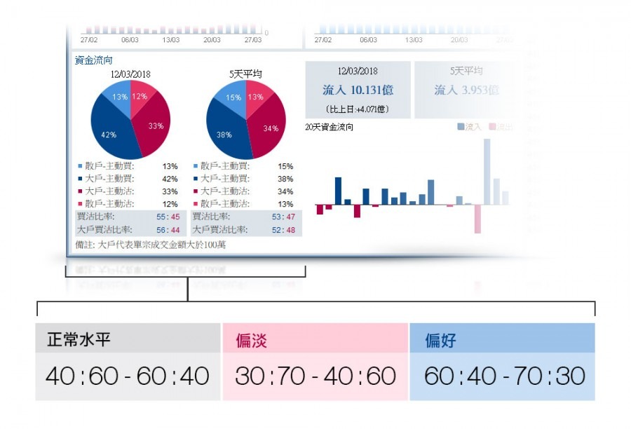 至於大戶主動買沽比率,分析方法與上述相同;我們可同時研究的,為主動買盤與主動沽盤中,大戶交易所佔比率的變化。最後,我們亦可觀察每個交易日個別股票淨主動流入資金的變化,並拿該數值與過去五個交易日的平均淨主動流入資金作比較,以判斷股價的再升/再跌動力。