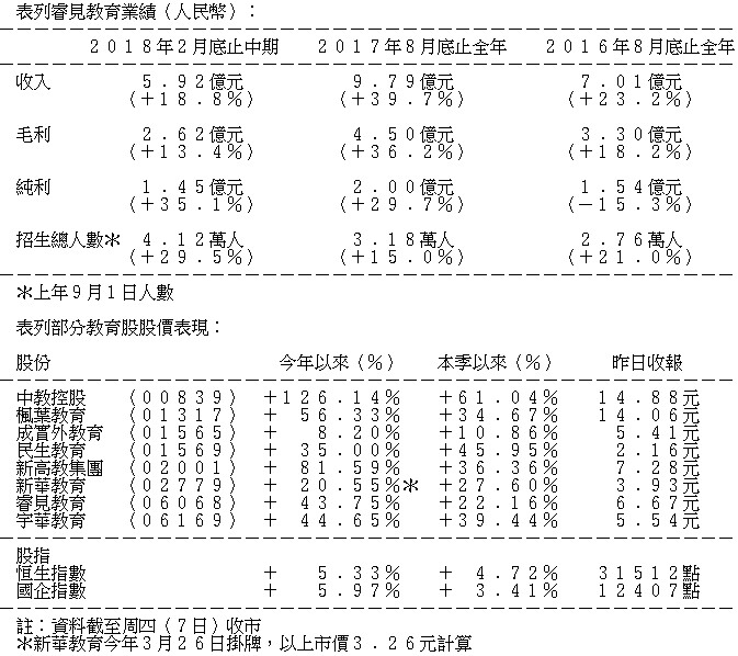 根據集團截至2月底止中期報告,半年純利1.45億元人民幣,按年增長35.1%,每股基本盈利7分人民幣,中期息每股3.2分人民幣。期內,收入增加18.8%,至5.92億元人民幣;毛利增13.4%,至2.61億元;核心淨利潤升34.8%至1.63億元人民幣;而2017年9月1日招生總人數按年升29.5%,至4.12萬人。