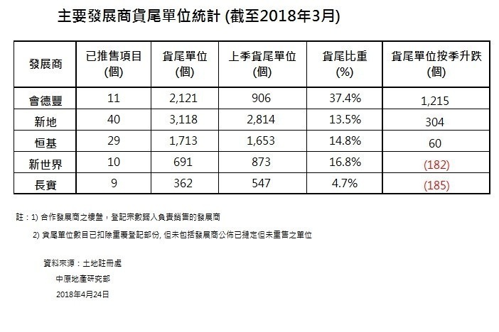 而中原地產研究部數據顯示,五大發展商,包括長實、新地、恒地(00012)、新世界發展(00017)及信置(00083),截至今年第一季旗下項目包括樓花在內的新盤貨尾量為11372個,當中新地手持3118伙堪稱「囤王」,而長實則最少只有362伙。(見表)