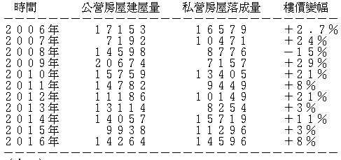 2006年-2016年,香港私人樓價癲升179%,背後一大元兇當屬房屋供應嚴重不足。其中,2011-2016年度,資助出售單位更為0。表列曾蔭權、梁振英任內房屋供應及樓價變幅: