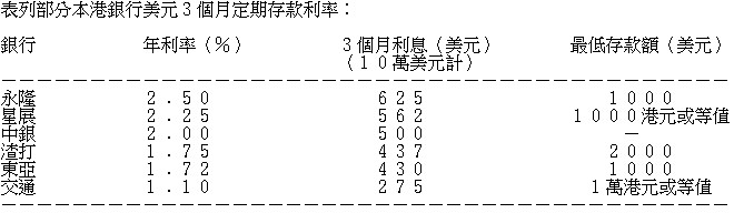 目前,本港銀行提供3個月美元定期存款利率可達2.5%,例如永隆銀行,美元3個月定期存款利率2.5%,每10萬美元存三個月可收取625美元(見表)。