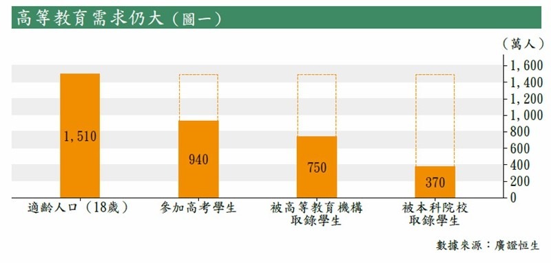 內地高等教育招生人數在2012年以來一直上升,但高等教育本科學校錄取率仍處於較低的水平,在適齡人口中,僅五成為高等教育機構錄取,而本科院校的比率更低,不到25%,高等教育市場存在較大的增長空間(見圖一)。