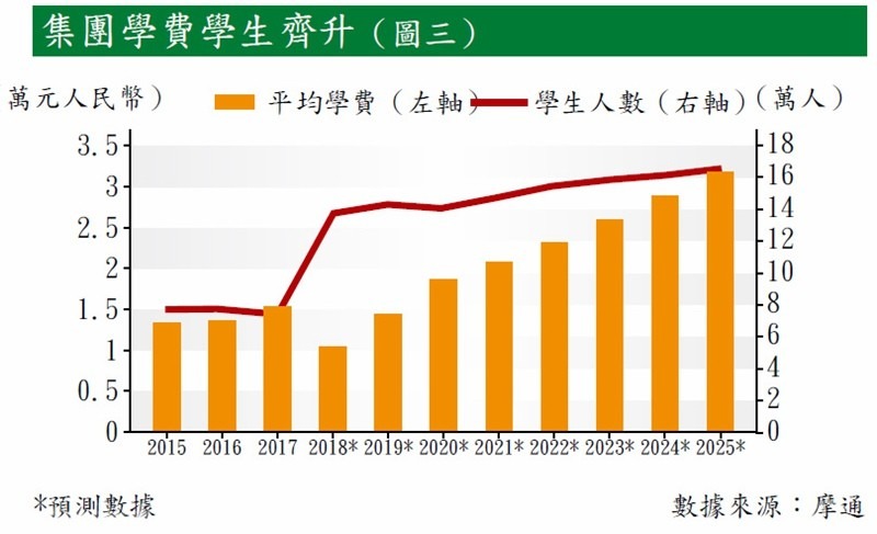 辦學口碑自然重要, 一方面三所學校所在地區屬經濟較發達的地區,同時集團積極推動校企合作,旗下三家學校,在2014年到2017年,初次就業率都達到88%以上,遠高於中國高等教育畢業生平均78%的水平(見圖二)。難怪除了今年度預計在併購後平均學費略有下降後,摩通預計未來學費及收生將持續上升(見圖三)。
