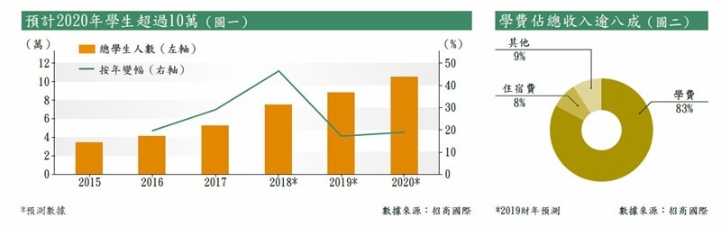 由於希望教育尚有不少學校正在擴建或計劃擴建,總學生人數仍有不少增長空間,招商證券預計,今年至2020年,年均複合增長率為18%,屆時總學生人數將超過10萬名(見圖一)。