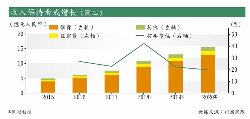 除了學生人數增加,希望教育收取的學費同樣有提升空間。招商證券指出,由於目前該校的學費處低水平,加上學生畢業就業率高,估計至2020年,學費每年可以增加4%。而學費佔希望教育收入逾八成(見圖二),加上住宿費及其他費用,在學生人數增加下,預計希望教育每年總收入可維持約20%增長(見圖三)。