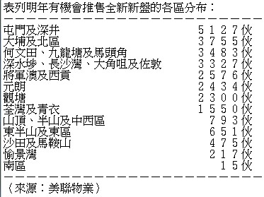 以區域分布,新界西區明年供應主導大市,以潛在全新新盤供應9328伙冠絕全港,九龍區以9110伙新供應排名第二,預料將有6806伙供應的新界東區排第三,而港島區供應仍屬最「珍貴」,只得共1459伙。