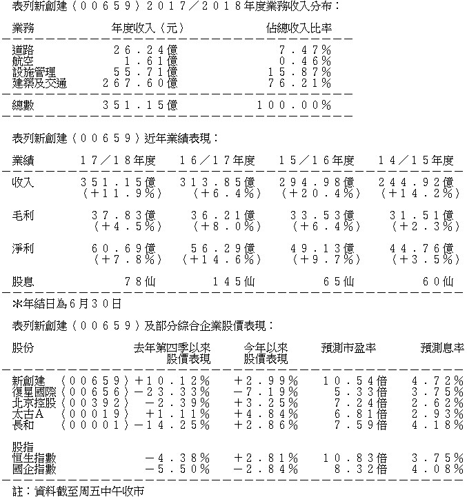 新創建為綜合企業,2017至2018年度收入增長約12%至351億元,主要業務分為四大類,建築及交通佔收入76%,其次為設施管理佔收入16%,其餘業務為道路和航空,兩項業務合計只佔收入8%。該公司接近90%的收入來自香港。2017至2018年度各項業務的應佔經營溢利(未計總辦事處及非經營項目前可供分配的溢)增長8%至約52億元,最主要來源為道路,佔37%,其次為建築及交通佔23%,航空和物流(透過合營企業經營)並列為第三大溢利來源,同時佔13%。各類業務最近兩年表現穩定。香港業務和中國內地業務分別佔39%和50%的應佔經營溢利。股東應佔溢利達到約61億元,較應佔經營溢利多出約9億元,主要是出售首都機場(00694)的部分權益錄得部分出售及重新計量收益約19億元所致。