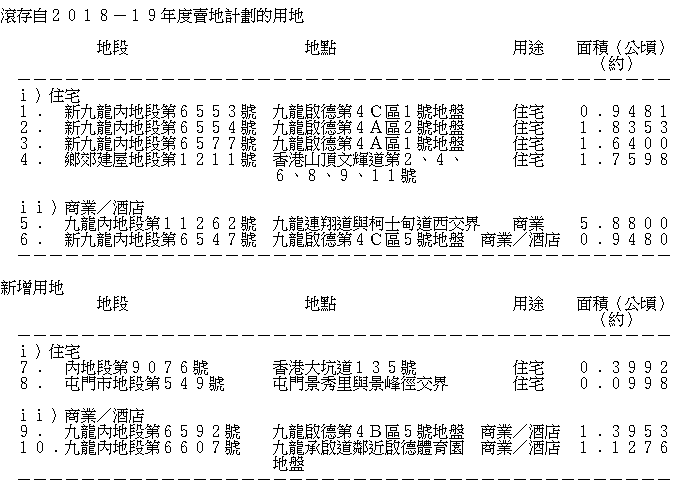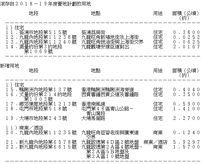 發展局局長黃偉綸公布2019-20年度賣地計劃,將會推售15幅住宅用地,預計可供應8850個單位。連同兩個鐵路物業發展項目及重建項目,下一財政年度可供應15540個住宅單位,超出供應目標的13500個單位。