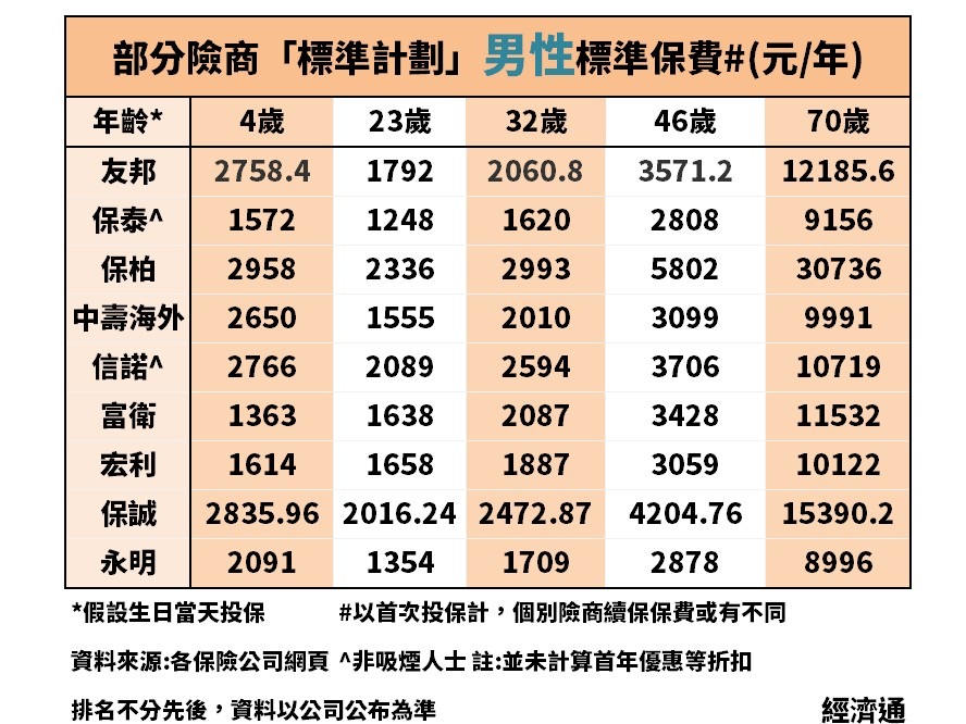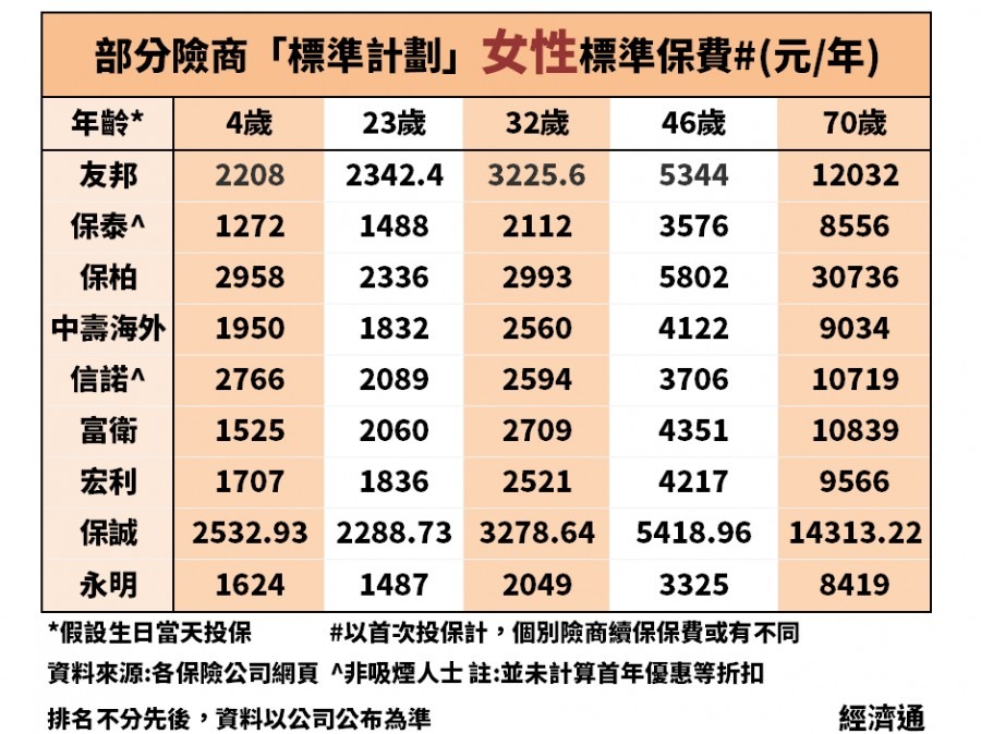 政府規定保險公司必須公布保費表,每家險商的標準保費表均詳細列出0至100歲的每個年齡標準保費,消費者格價從此更加方便。本欄為讓讀者了解不同人生階段的保費,特別選了4、23、32、46及70歲,列出部分險商的標準計劃首次投保標準保費,如險商有劃分吸煙人士或非吸煙人士,則列出後者保費(見表)。